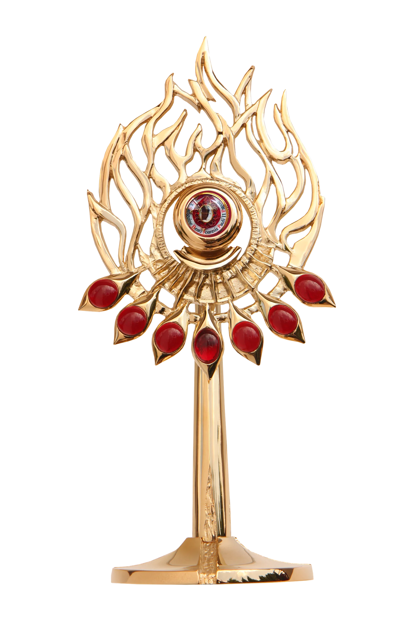 Relikwiarz w formie płomieni to symboliczne dzieło sztuki sakralnej, które łączy złoconą oprawę z czerwonymi elementami nawiązującymi do mocy i ognia Ducha Świętego. Jego dynamiczna forma sprawia, że wyróżnia się w każdej przestrzeni liturgicznej, a jednocześnie zachowuje elegancki i podniosły charakter.