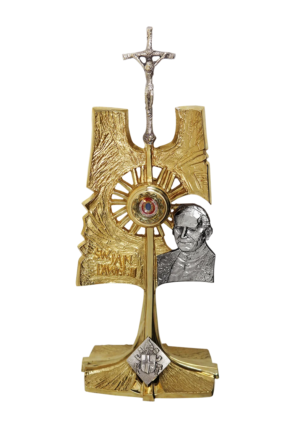 Relikwiarz św. Jana Pawła II to niezwykle okazałe dzieło sztuki sakralnej, które łączy duchowe przesłanie papieża z elegancją złoconej formy. W centrum znajduje się kapsuła na relikwie, a otaczający ją krzyż i promienista kompozycja symbolizują zwycięstwo wiary oraz światło Ewangelii.