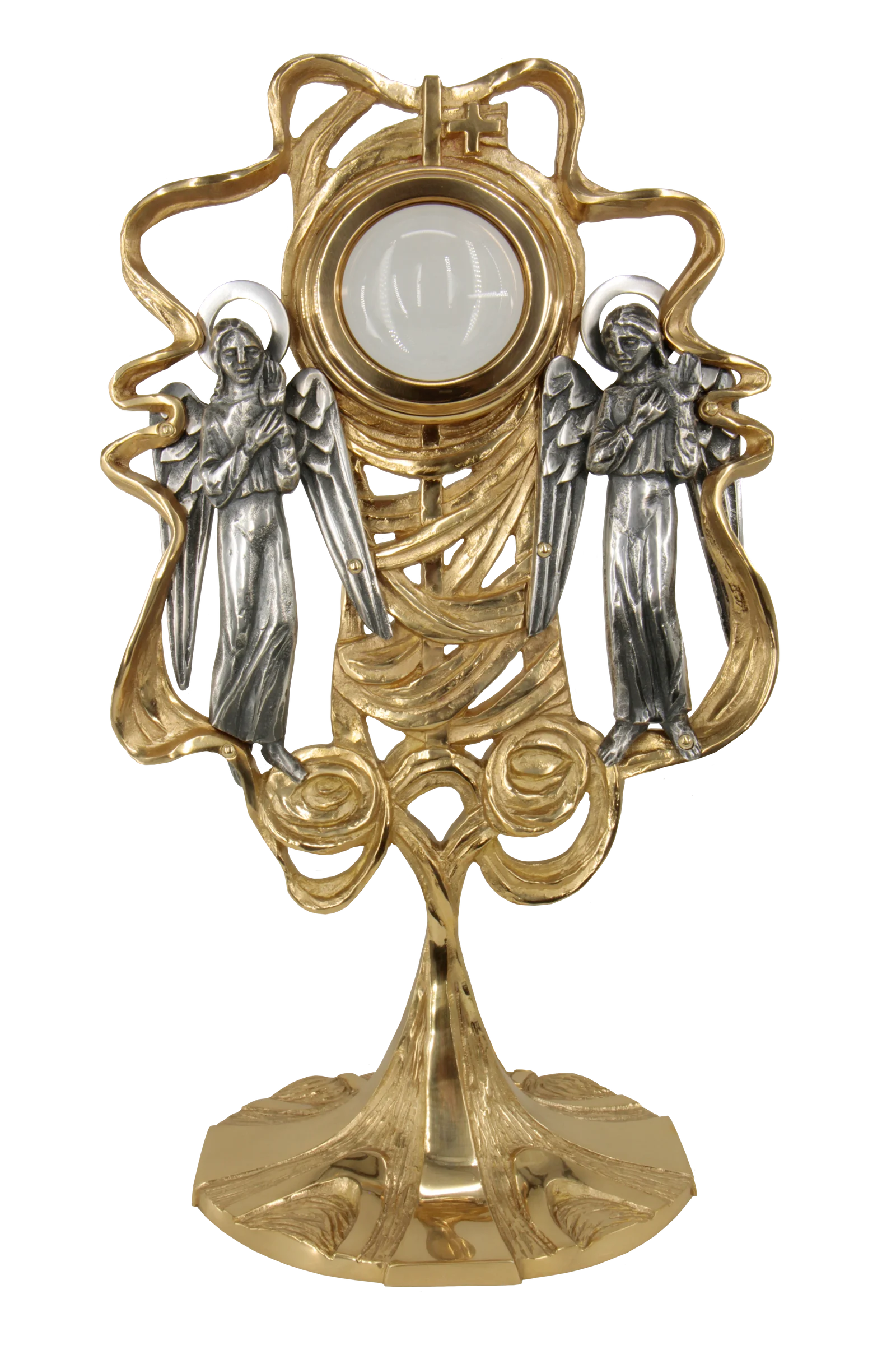 Uniwersalny relikwiarz z aniołami zachwyca bogactwem detalu i głęboką symboliką. Złocista forma oplatająca centralne miejsce na relikwie przywodzi na myśl niebiańską chwałę. Po obu stronach stoją aniołowie, którzy symbolizują opiekę i nieustanną obecność Bożej łaski. Dzięki temu całość nabiera wyjątkowo podniosłego charakteru.
