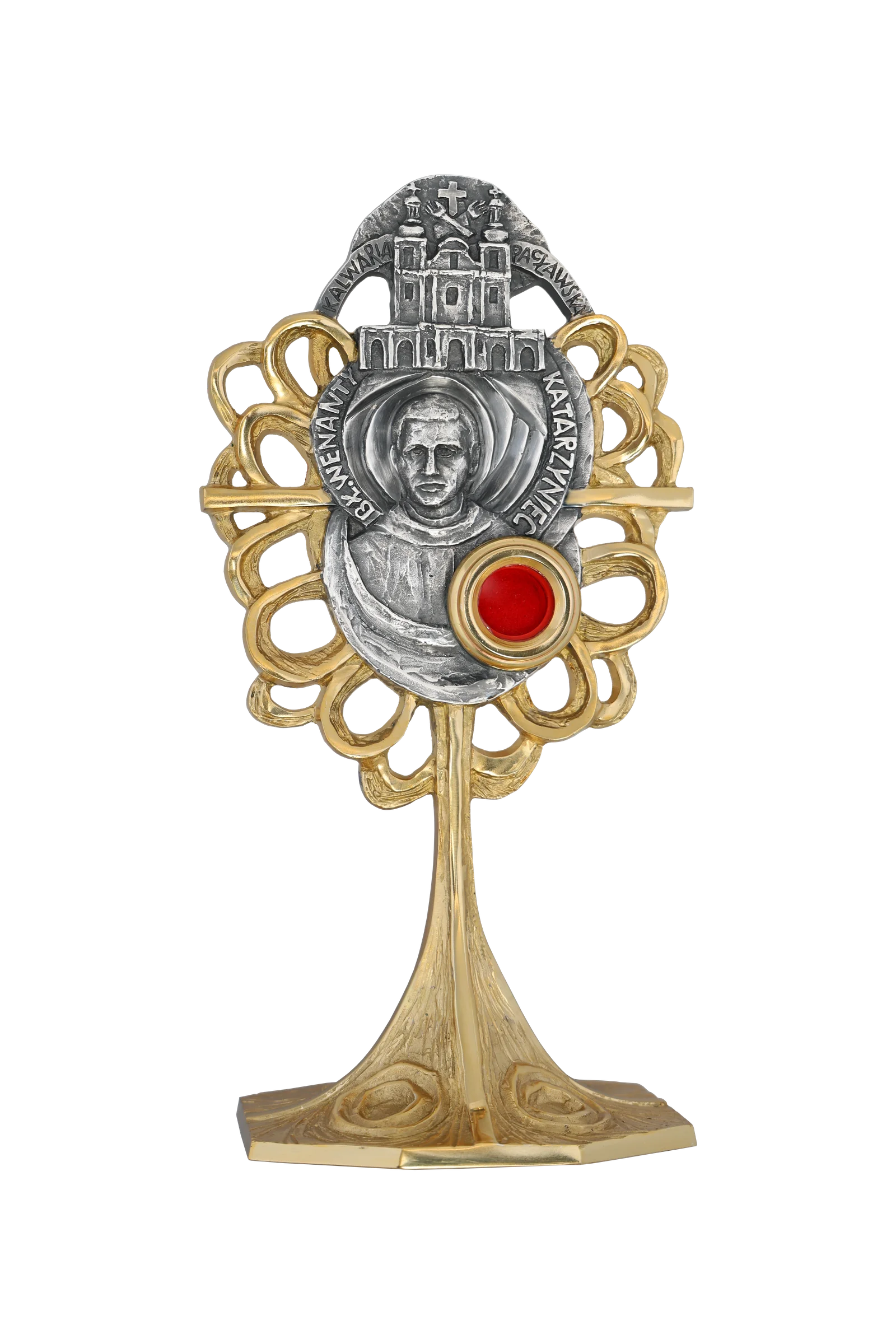 Relikwiarz sługi Bożego Wenantego Katarzyńca to wyjątkowa pamiątka duchowa, wykonana z najwyższą starannością. Wizerunek franciszkanina został umieszczony w otoczeniu architektonicznego motywu, który nawiązuje do jego życia zakonnego i głębokiej więzi z Kościołem.